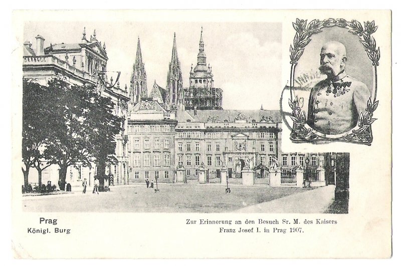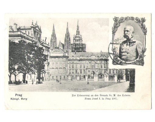 Portrait of emperor Franz Joseph and wiev at Hradčany , Prague