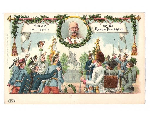 Color portrait of Franz Joseph , signs and emblems of national