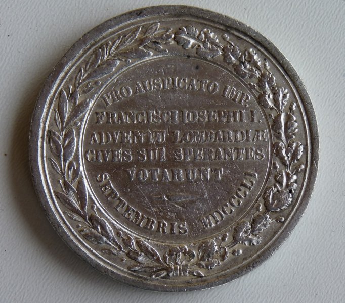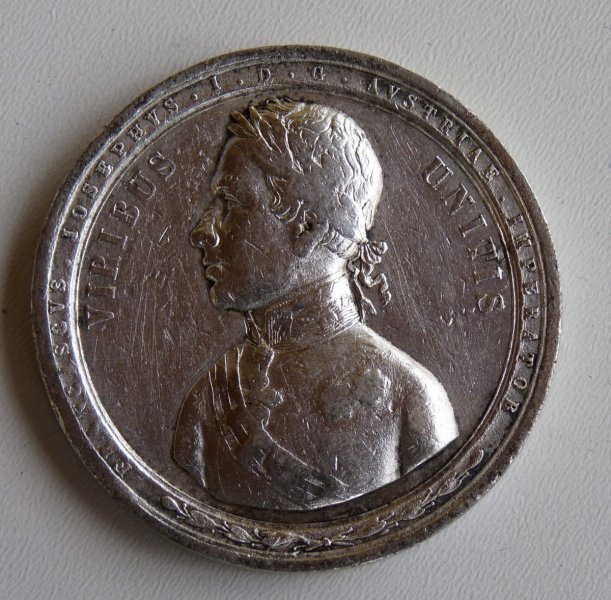 Silver medal of young emperor Franz Joseph with flowers on frame