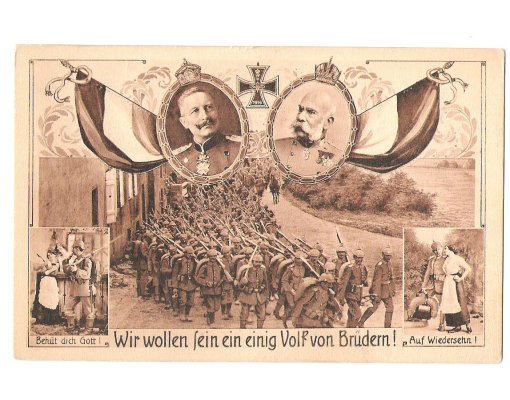 Soldiers march to the front , emperors Franz Joseph and Wilhelm