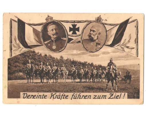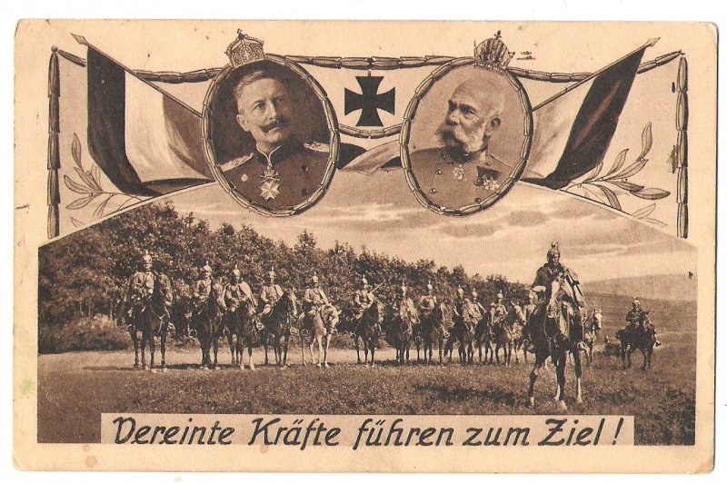 Artistical postcard - flags , soldiers ,Franz Josef and Wilhelm
