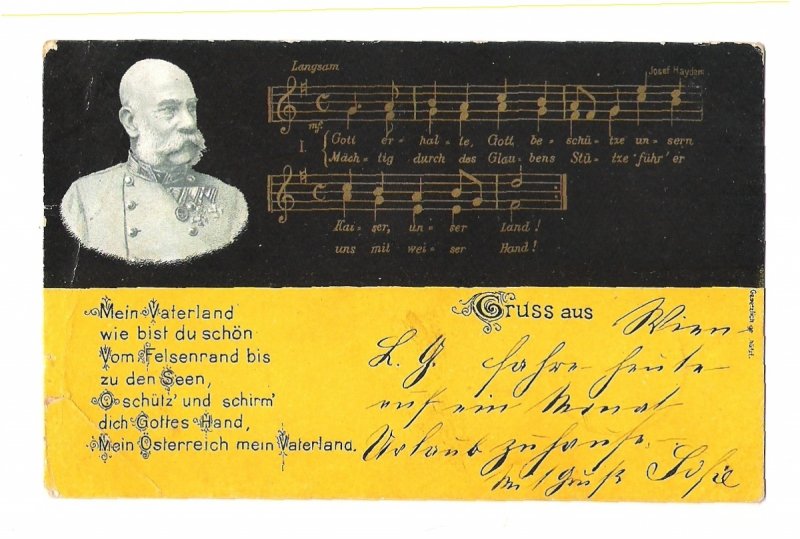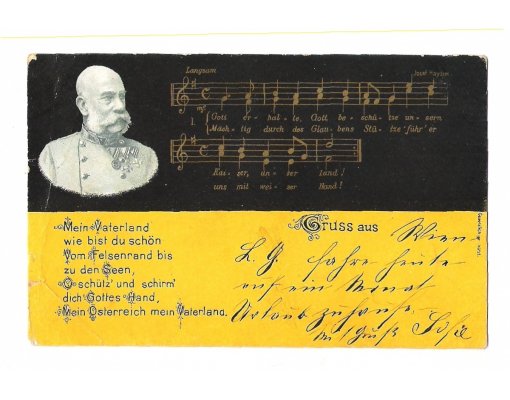 Song and Franz Joseph on flag , message on postcard