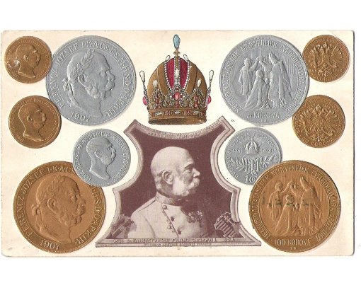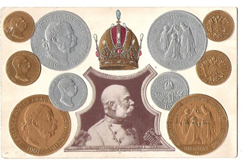 Cards with coins Franz Josef - Franz Josef sitting with imperial anthem , the Hungarian edition