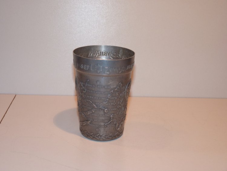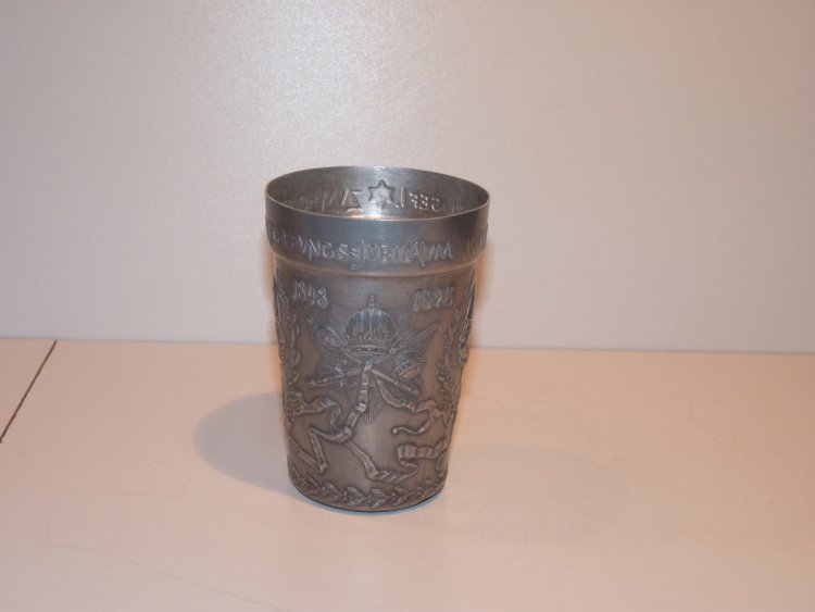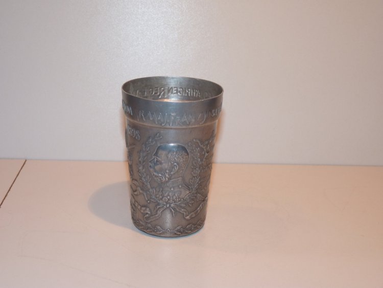 Tinny cup with portrait of Franz Joseph, symbols of empire and 50th anniversary of his government