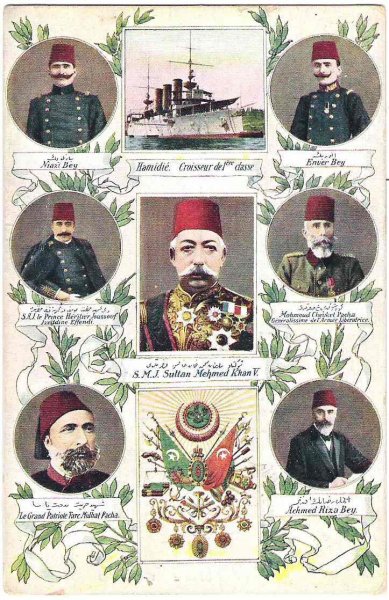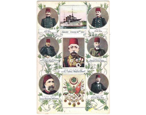Turkish sultan Mehmed Khan V., his generals and flag ship of war, empire symbols of Turkey
