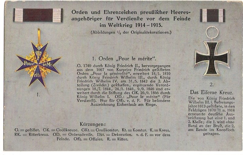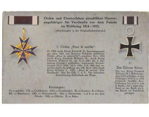 Honours and crosses in World War One 1914 -1915 : Honour Pour le Merite and Iron cross
