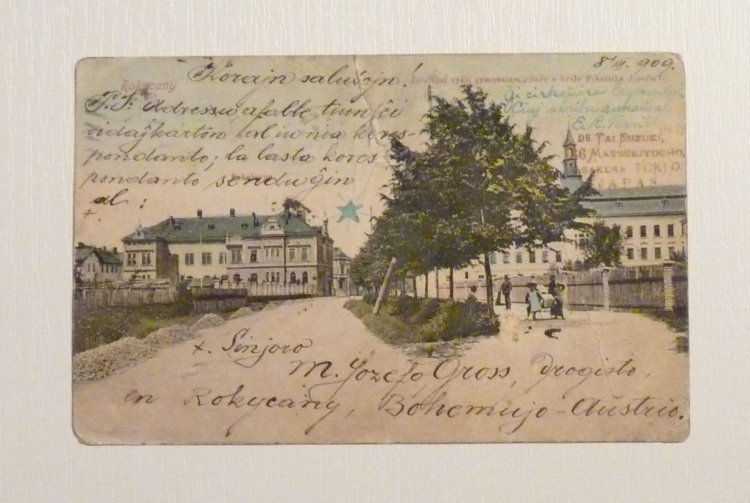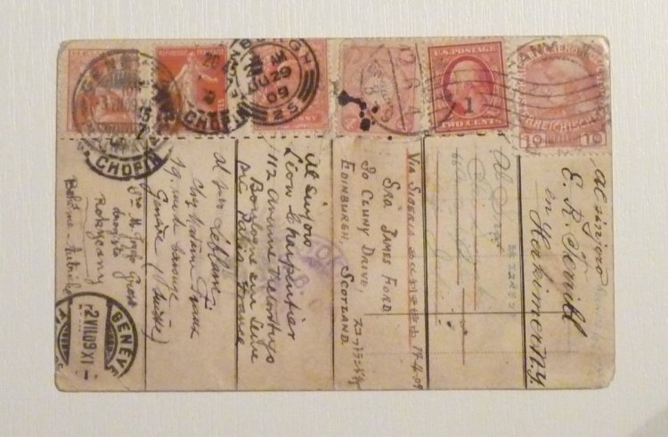 Esperanto pohlednice frankována známkami Rakousko, Amerika, Čína, Anglie, Francie a Švýcarsko