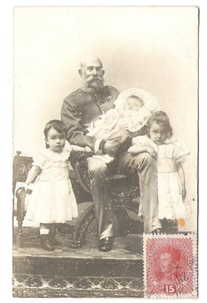 Foto Franz Josefa a jeho vnoučat, spolu s poštovní známkou