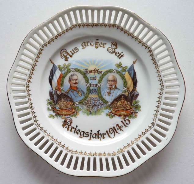 Malý zdobený talíř císařskými korunami a vlajkami s císaři - František Josef a Vilém / 1914 - 1915