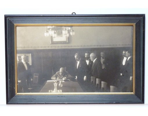 František Josef při podpisu smlouvy - tato originální fotografie byla použita jako předloha k známé pohlednici ( pouze jen část obrazu s F.J.I. ) - mimořádné