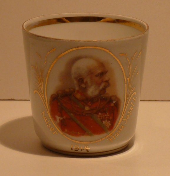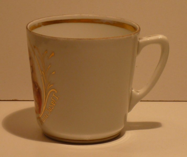 František Joseph I. v maďarské uniformě, v barevném zpracování na hrnečku