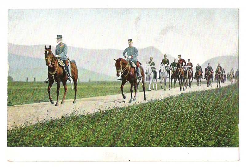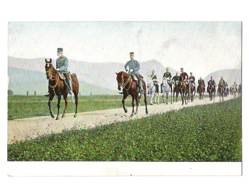 Franz Josef a velitel jsou vpředu , za nimi jede skupina vojáků