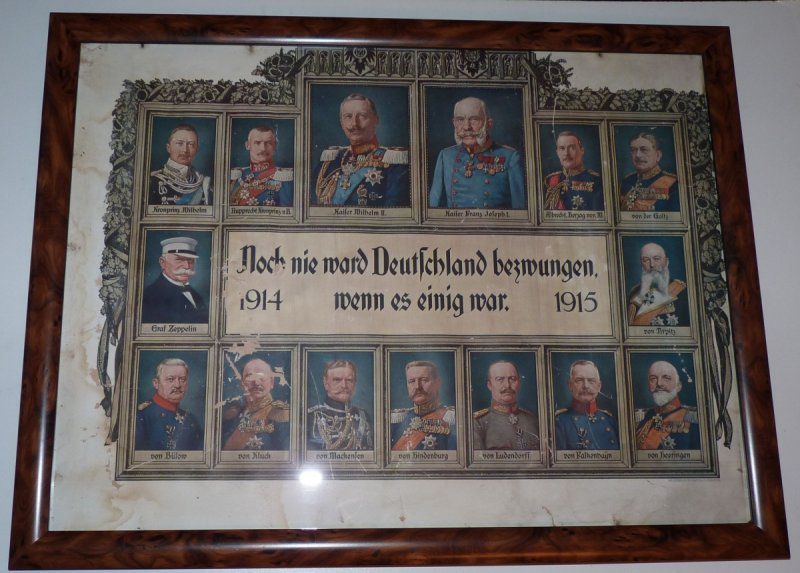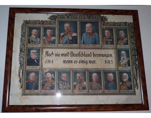 Stará litografie s portréty dvou císařů ... Franz Josef a Wilhelm + členové velení - začátek války