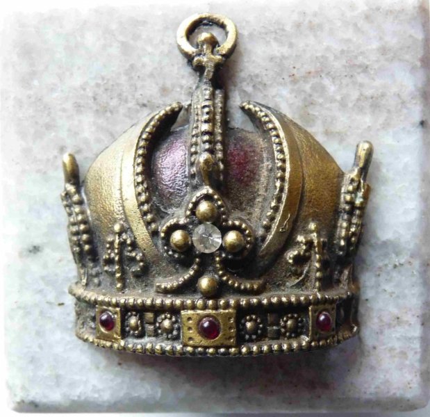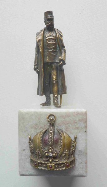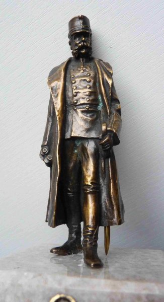 Mosazná socha císaře v polní uniformě na mramorovém podstavci s císařskou korunou
