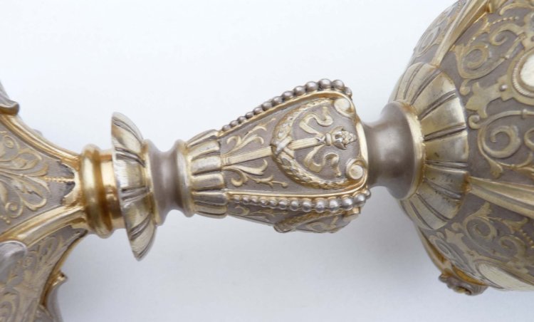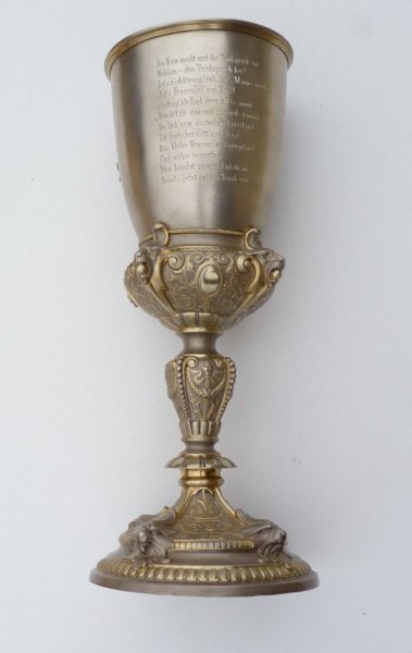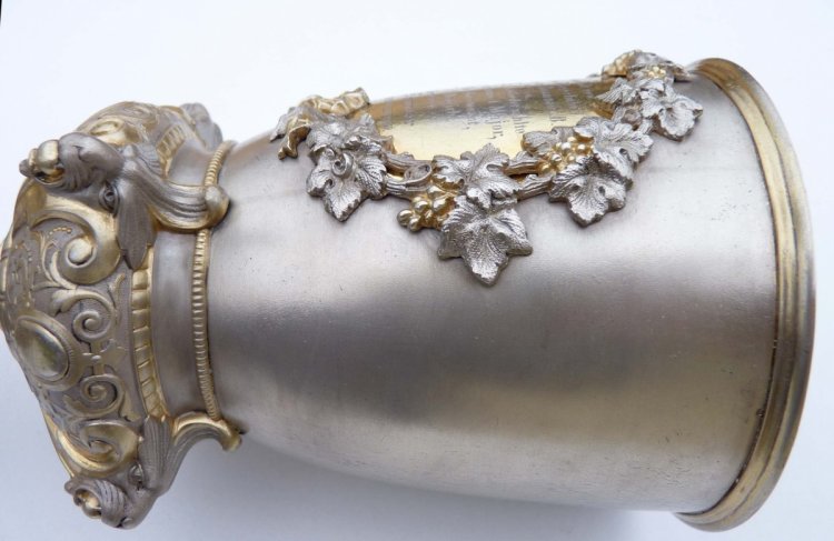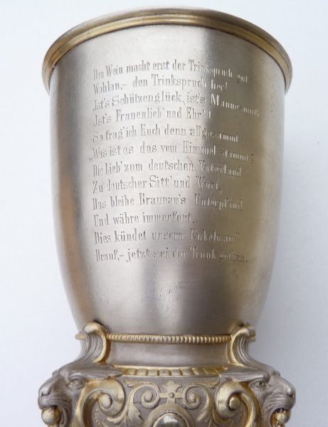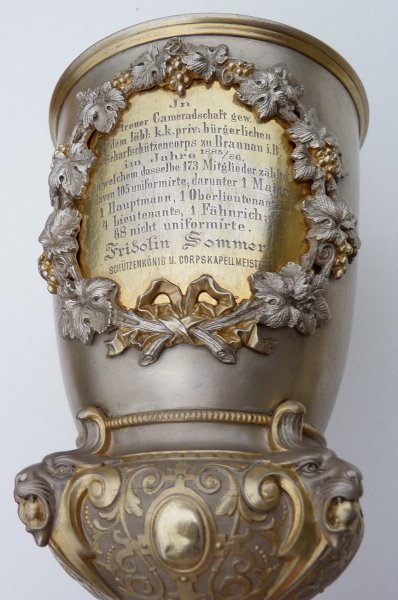 Zlacený stříbrný pohár - darovaný z úcty od střeleckého krále a vojenského kapelníka - Fridolín Sommer - členům střeleckého klubu K.K. Braunau v Čechách - Broumov rok 1885-86 ( na poháru je soupis členů .... ) pohár je 27 cm vysoký a váha 0,5 kg