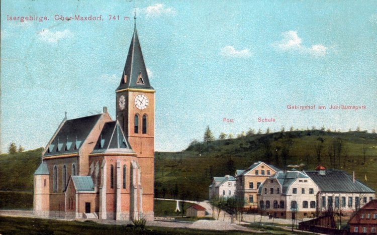 Na první pohlednici jsou nejvýznamnější budovy Horního Maxova: kostel, pošta, škola a hostinec Gebirgshof am Jubiläumspark. Vpravo vedle kostela je pomník císaře Františka Josefa I. z roku 1908.