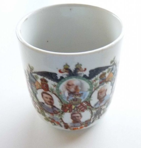 Čtyř portrét na porcelánovém hrníčku - František Josef , Karel a dva generálové/ Hotzendorf a Friedrich ( v museu je tento již druhý )