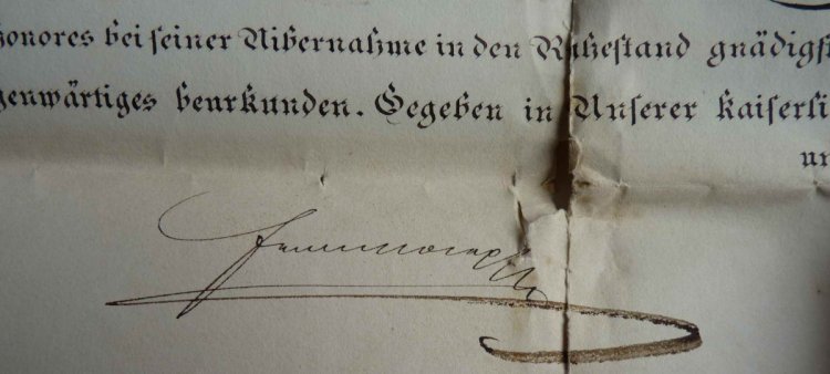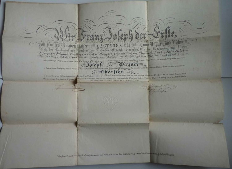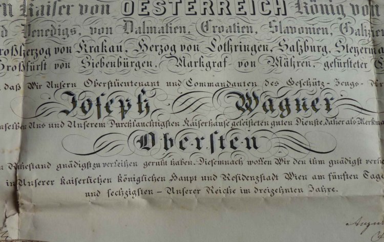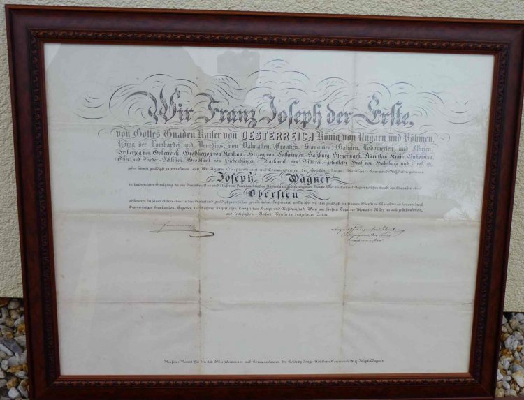 Joseph Wágner - dekret na pergamenovém papíře s podpisem Františka Josefa/ mimořádné