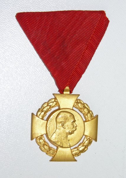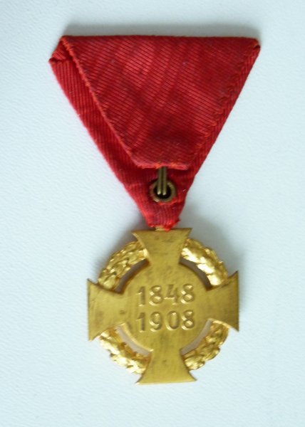 Jubilejní kříž z roku 1908 na vojenské stuze , zlacená bronz