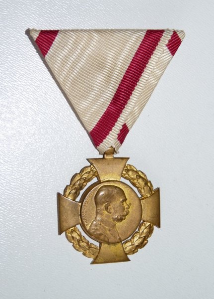 Jubilejní kříž z roku 1908 na vojenské stuze , zlacená bronz