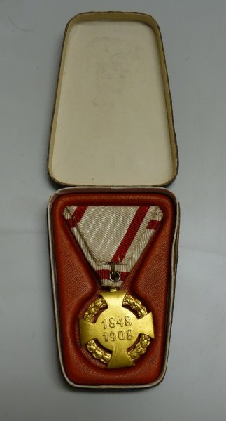 Jubilejní kříž z roku 1908 na vojenské stuze , zlacená bronz - originální etue