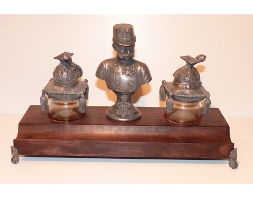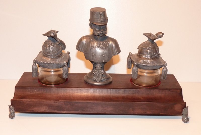 Kalamář - zinková busta císaře Františka Josefa I. s helmicemi