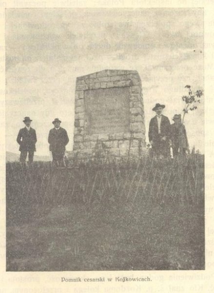 K odhalení pomníku došlo 8. září 1908 z iniciativy vedení tehdy ještě samostatné obce. Byl postaven na vyvýšenině, odkud František Josef sledoval 4. září 1906 průběh vojenských manévrů své armády. Vojenské cvičení trvalo několik dní a konalo se na různých místech v okolí Těšína a Třince. Zúčastnilo se ho víc jak 60 tisíc vojáků. "Historické materiály týkající se těchto významných manévrů jsou uloženy v Muzeu Śląska Cieszyńskiego v polském Těšíně," sdělil jeho ředitel Marian Dembiniok. Zmínka o výstavbě císařského památníku se kromě dobového tisku objevuje také v polsky psané kronice Lyžbic. Zápis provedl tehdejší kronikář Matula. Zmínil se, že na přelomu srpna a září 1906 se v okolí Těšína konaly císařské manévry, kterých se účastnil sám císař František Josef I. Cvičení vojsk pozoroval z pahorku Hůrka, a že na tomto místě byl 8. září 1908 odhalen památník, který kromě této události připomínal 60. výročí vlády panovníka.