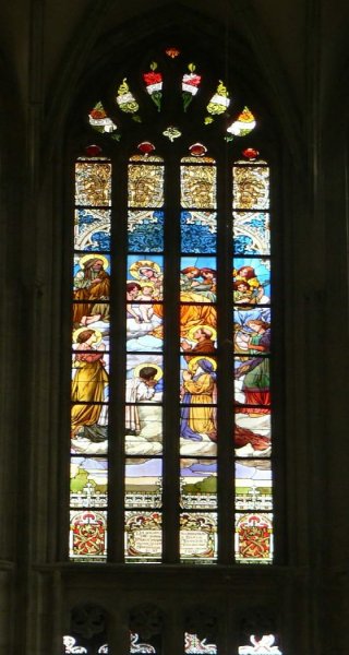 Prostřední malované okno nad hlavním oltářem chrámu sv. Barbory připomíná oslavy 70. narozenin císaře FJI. Jeho donátor, rada vrchního zemského soudu JUDr.Schneider-Svoboda, v dopise předsedovi archeologického spolku Vocel vyslovil přání, aby bylo toto okno opatřeno následujícím věnovacím nápisem: