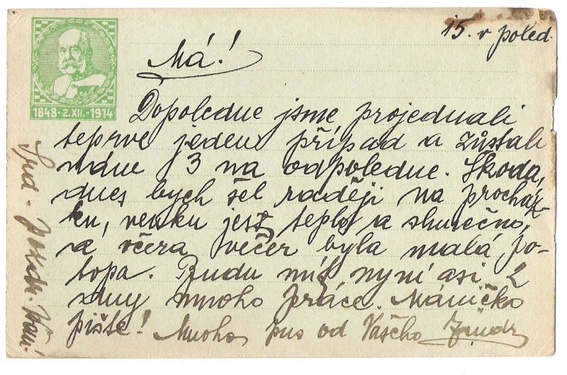 Lístek polní pošty se zelenou přítiskovou reklamní známkou F.J.