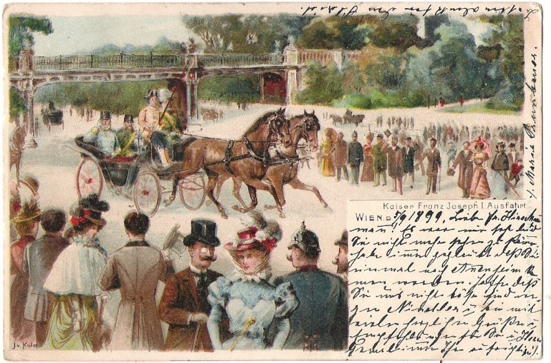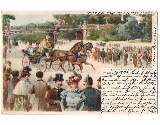 Malovaná pohlednice - císař na projížďce v kočáru
