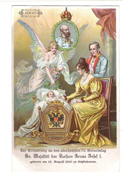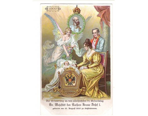 Malovaná pohlednice vydaná k 70. narozeninám Franz Josefa I.