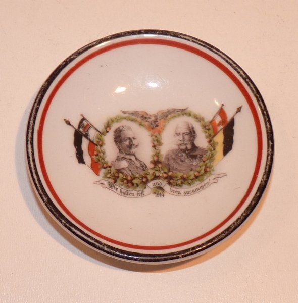 Malý talířek s portrétem Franz Josefa I. a Wilhelma II. se znaky a vlajkami