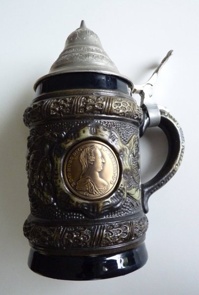 Novodobá replika starého půllitru s cínovým víkem a pozlacenými medailemi s portréty Marie Terezie a Františka Josefa I.