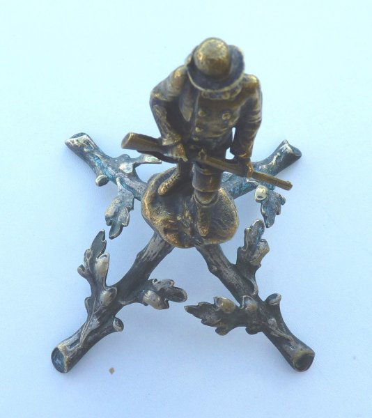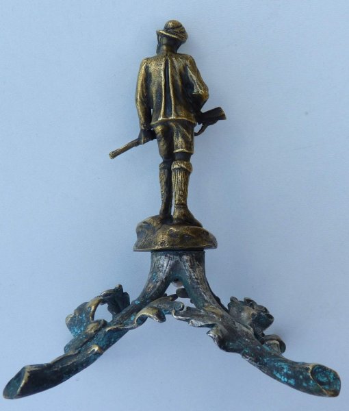 Miniaturní socha císaře Františka Josefa v mysliveckém - na podstavci / tato soška v museu již zastoupena je - ale bez podstavce . patinovaný zinek nebo mosaz