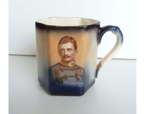 Mladý uniformovaný císař Karel na modrém hrnečku