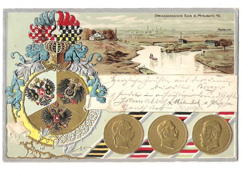 Myslowitz, mince tří císařů a ozdobný erb, s psaným textem
