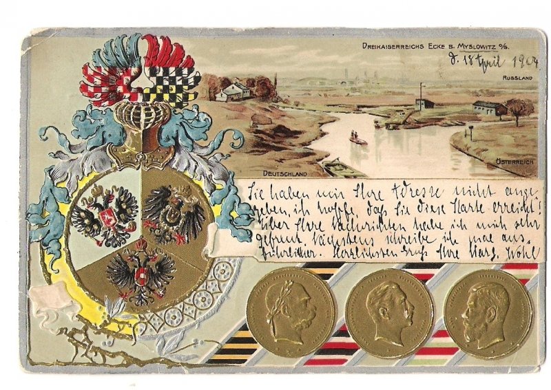 Myslowitz, mince tří císařů a ozdobný erb, s psaným textem v němčině