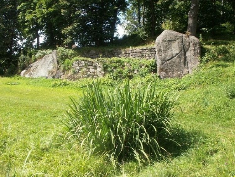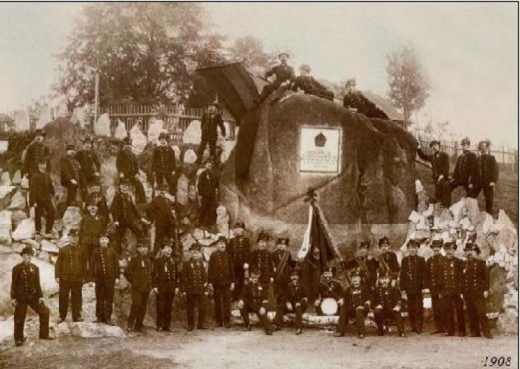 s Konrádem Königem starším (na snímku je to ten sedící zcela vpředu - nalevo od muže s bubínkem) byl při této příležitosti umístěn na skalisku, vystupujícím na severní straně velkého loďkového rybníku, pamětní nápis, připomínající tuto událost. V letech následujících se stejně jako celý areál Königova hotelu i toto místo dál vyvíjelo. Nápis na skále byl nahrazen záhy pamětní deskou, vedle skály vznikla kamenná terasa se schodištěm, na níž byl umístěn dřevěný zámeček. Pod terasou – na břehu rybníka – se nalézal prostor se sezením pro hotelové hosty ohraničený kamenným valem. Skalisko bylo tehdy nazýváno císařským kamenem (Keiserstein), v průběhu první republiky pak musela být pamětní deska jako symbol rakousko-uherské monarchie sňata.