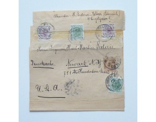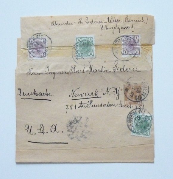 Novinová přelepka 3 Heller, dofrankována 2 krát 1 Kr a 2 krát 5 Kr , odeslaná do USA