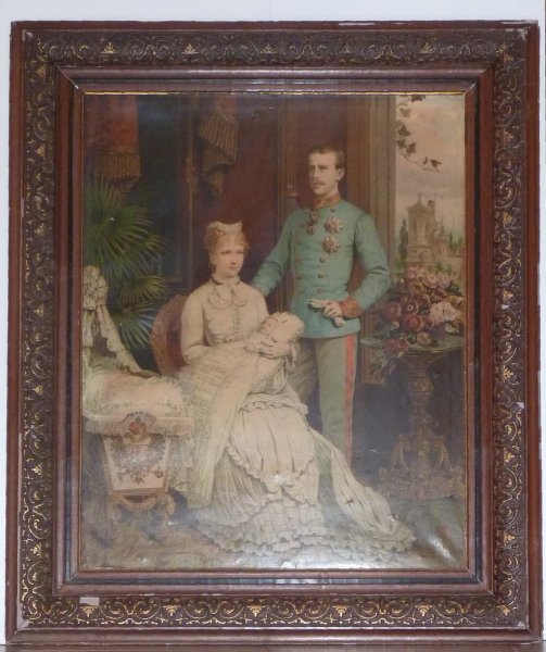 Oficiální obraz - zobrazující arcivévodu Rudolfa následníka trůnu s chotí - princeznou Stefanií . Jedná se o původní , dobový tisk olejového obrazu - 80.léta 19.století .Tisk je nalepen na plátně .Tento typ obrazů byl určen do úředních místností monarchie