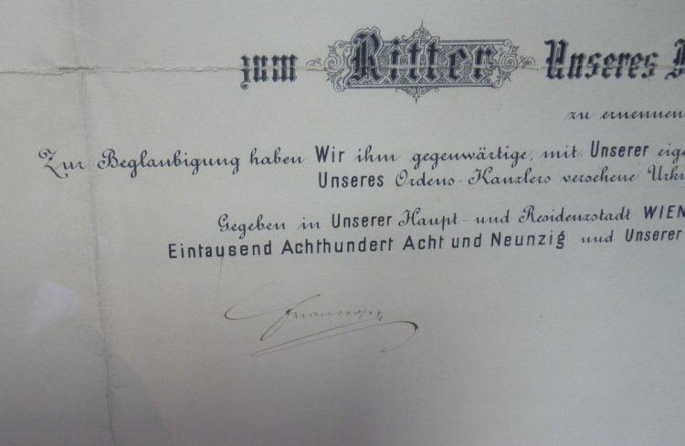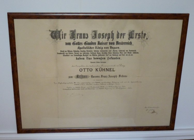 Otto Kühnel - listina s podpisem Franz Josefa - Řád FJ I.