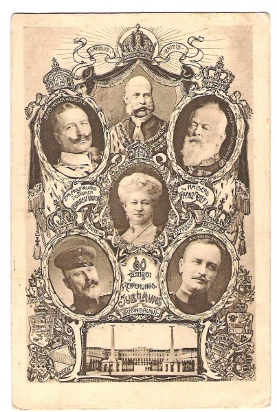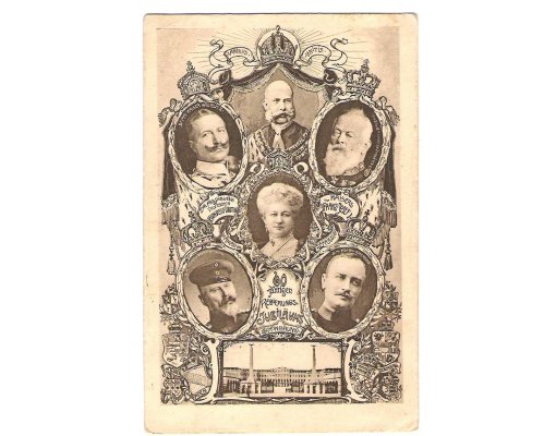 Pohlednice k 60.letům Franz Josefa- s portréty ostatních gratulantů