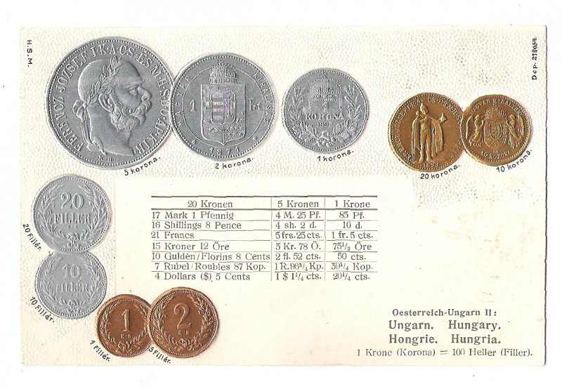 Pohlednice s mincemi Franz Josefa- maďarské vydání