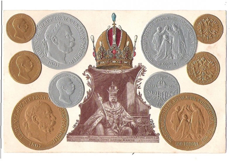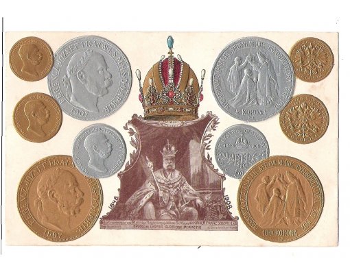 Pohlednice s mincemi Franz Josefa- sedící Franz Josef - rakouské vydání