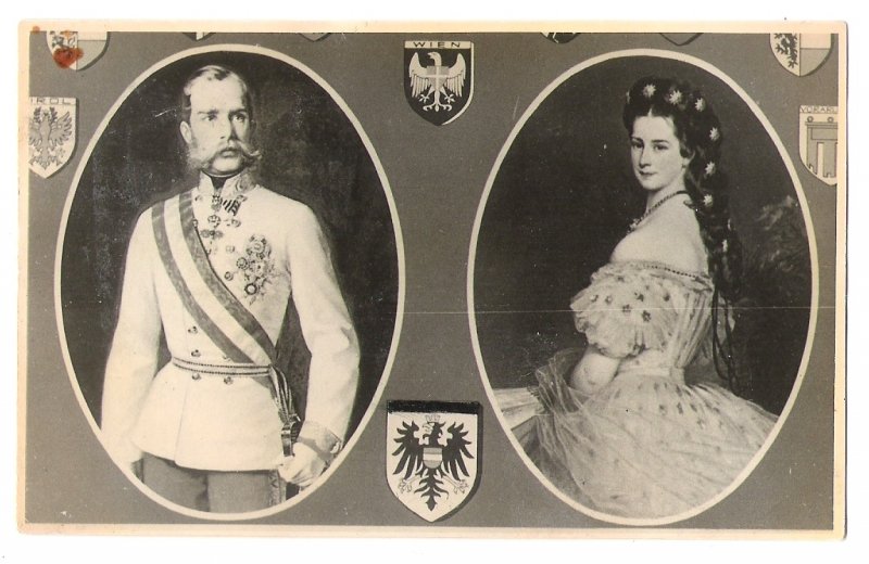 Portréty Franz Josefa a Elisabeth, se znaky nebo erby Vídně