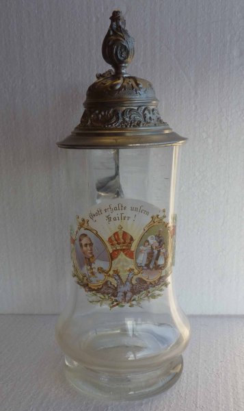 Skleněný půllitr s cínovým víkem - portréty mladého a starého Františka Josefa s dětmi budoucího císaře Karla