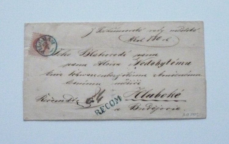 Rekomando dopis frankovaný jednou 5 Kr, jednou 10 Kr- modrá razítka