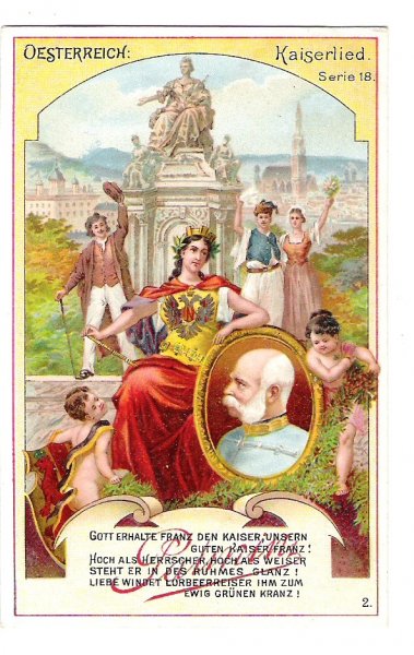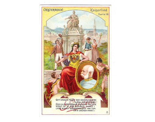 Patriotická kartička - portrét císaře / v pozadí monumentální socha Marie Terezie