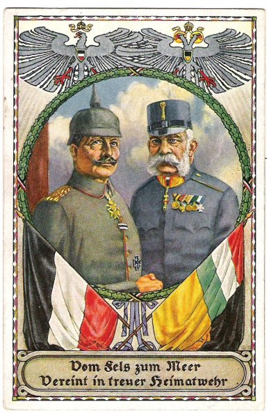 Barevná pohlednice císaře Franz Josefa a Wilhema , symboly obou mocnářství