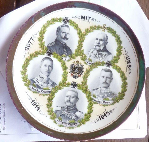 Franz Josef , Wilhelm , Hindenburg , německý a bavorský korunní princ . V museu je již podobný talíř - tento je r.1915 / první je s ručním přepisem 1916 .